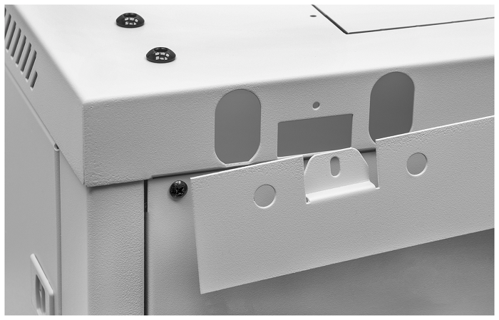 Дверь шкафа металлическая и поставляется с замком. Установка двери возможна как с правой, так и с левой стороны. Замок защищает от нежелательного доступа третьих лиц в шкаф. Боковые панели шкафов - легкосъемные для упрощения доступа к установленному оборудованию, снабжены защелками.