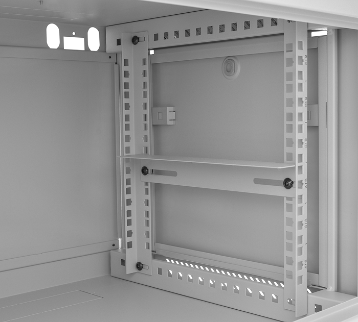 В комплекте идут монтажные вертикальные направляющие для крепления стандартного 19 дюймового оборудования. Направляющие пронумерованы в соответствии с количеством юнитов, для упрощения процесса монтажа. Направляющие регулируются по глубине. Доступ к оборудованию, устанавливаемому в шкафу, может осуществляться с трёх сторон. Шкаф поставляется в разобранном виде, цвет шкафа RAL 7035 (серый).