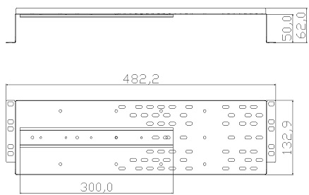 Выполнена из прочного стального листа и покрыта качественной ударопрочной-порошковой краской серого цвета (RAL 7035). Для облегчения конструкции и обеспечения естественной вентиляции за счёт конвекции, поверхность полки имеет перфорацию. Установка полки осуществляется за счёт её крепления к монтажным профилям шкафа в двух точках. Полка имеет габаритную глубину 60 мм и DIN-рейку шириной 300 мм.
