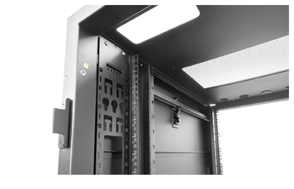 Вертикальные плоские органайзеры входят в комплект шкафа. Они имеют петли для быстрого монтажа вертикальных блоков распределения питания (PDU).