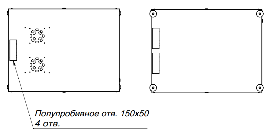 Шкаф имеет несколько полупробивных отверстий для кабельных вводов 150х50, для того, чтобы можно было осуществить ввод как с верхней, так и с нижней стороны.