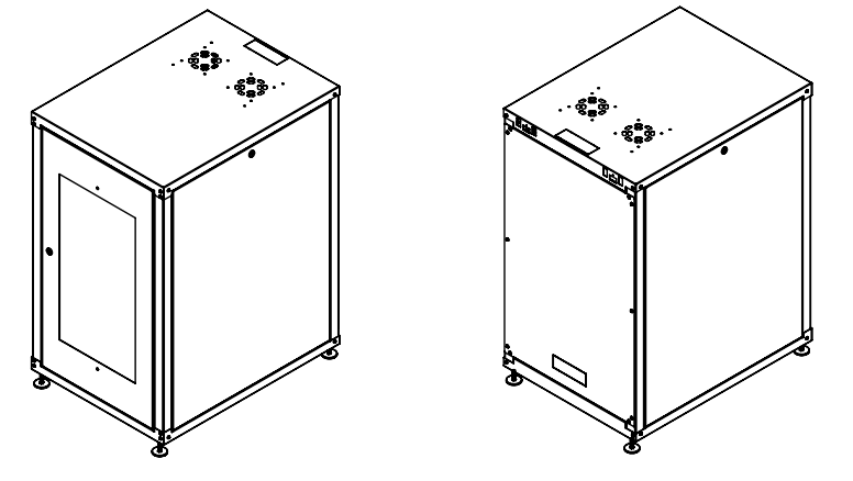 Боковые панели - съемные, позволяют получить быстрый доступ к установленному оборудованию. Передняя дверь с закаленным стеклом в металлической рамке, задняя съемная панель на винтах. Вертикальные направляющие можно регулироватьот 566 до 726 мм, что позволяет устанавливать оборудование различных размеров. Шкаф комплектуется регулируемыми опорами для компенсации неровностей пола. Шкаф поставляется в разобранном виде.