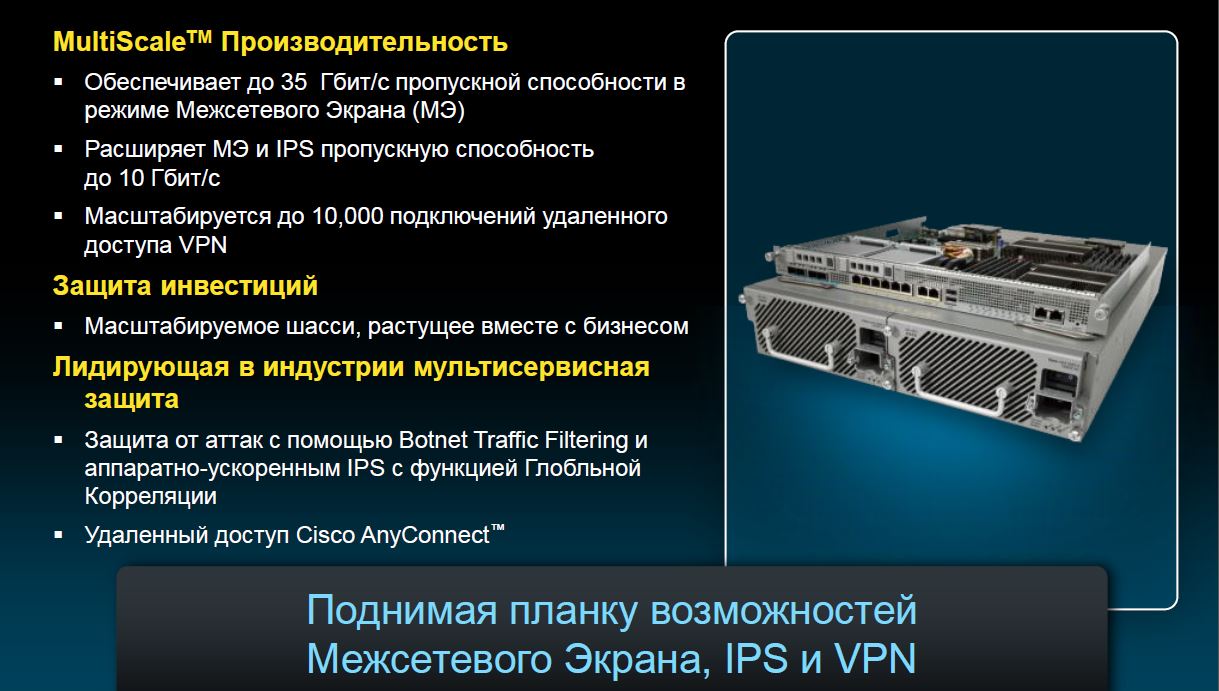 Непревзойденный уровень защиты позволяет отражать кибератаки повышенной сложности. Первый в отрасли межсетевой экран нового поколения (NGFW) с активной защитой от угроз. Самый распространенный межсетевой экран с контролем состояния в сочетании со средствами контроля приложений, системой предотвращения вторжений нового поколения и защитой от сложного вредоносного ПО (AMP) обеспечат вам абсолютную уверенность в защите.