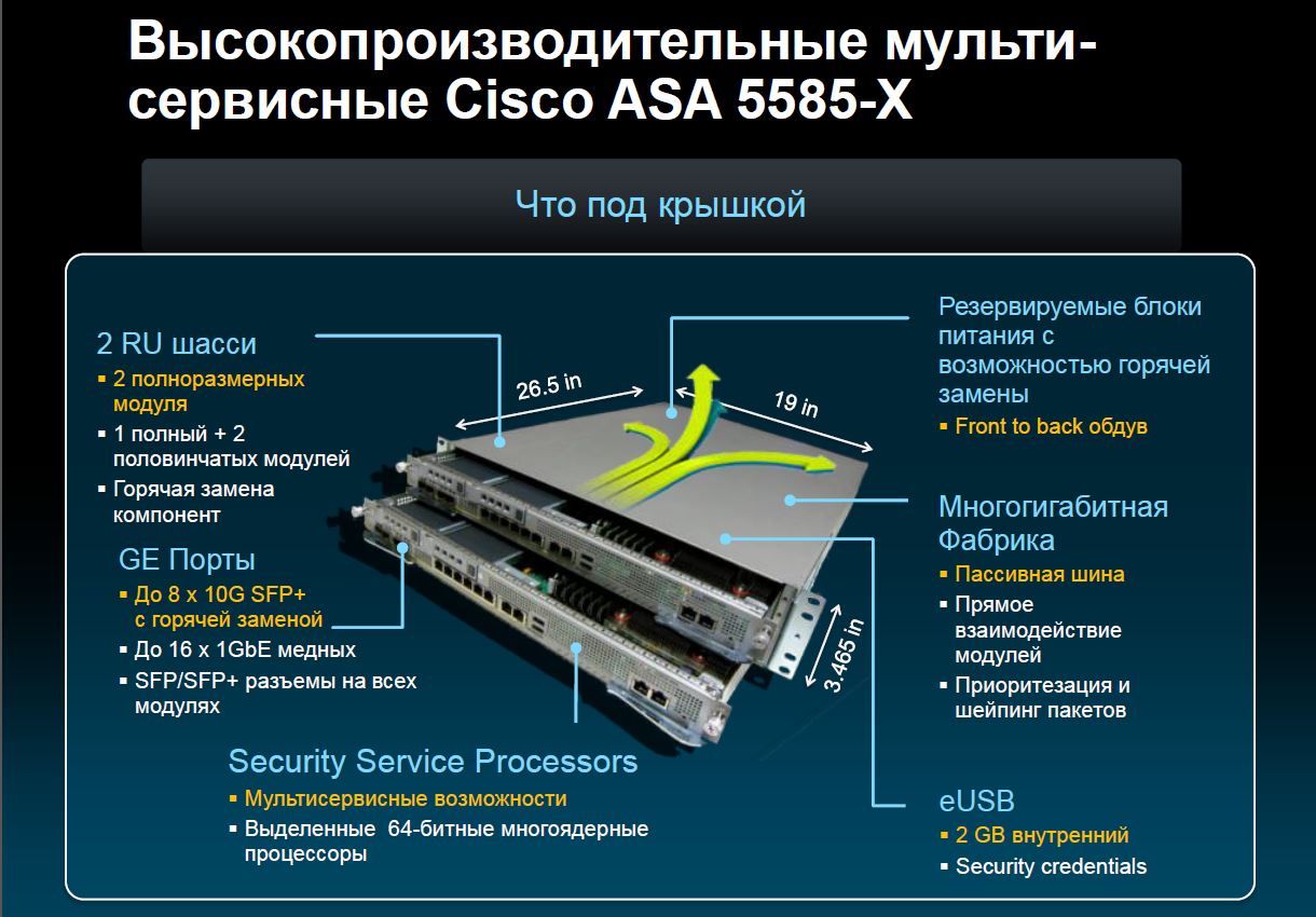 Cisco ASA 5585-X поддерживает до двух аппаратных блейда в одном шасси 2RU. Нижний слот (слот 0) содержит модуль межсетевого экрана с проверкой состояния ASA, в то время как верхний слот (слот 1) может использоваться для добавления второго модуля с целью увеличения количества портов и резервирования, что актуально для критически важных центров обработки данных и узлов связи.