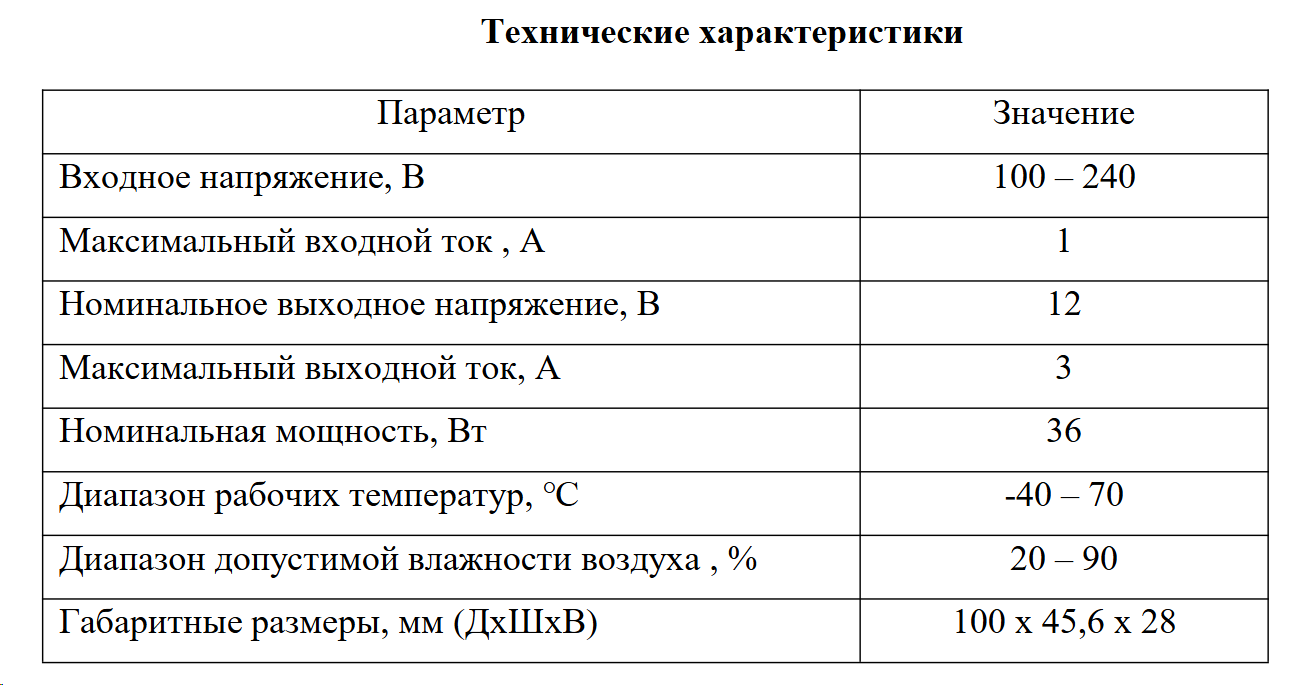 Блок питания с мощностью 36 Вт, входом 100...240V AC и выходом 12V DC до 3A.