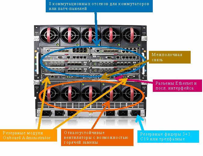 Одно шасси HP BladeSystem c7000 высотой 10U вмещает до 16 двухпроцессорных или 8 четырехпроцессорных серверов, со всей необходимой инфраструктурой питания и охлаждения, плюс 8 коммутационных модулей: коммутаторов Fibre Channel, Ethernet, Infiniband