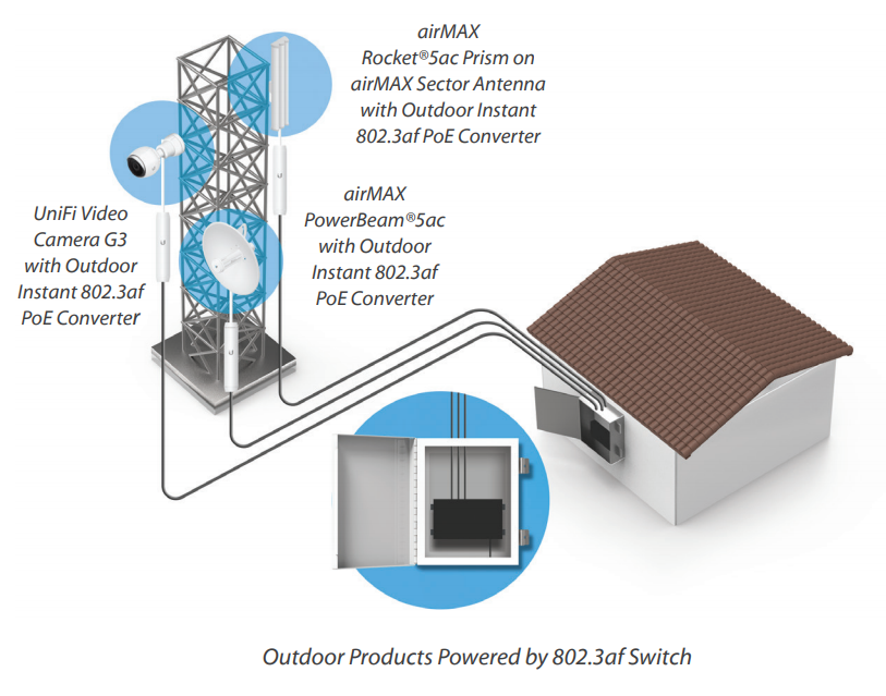 Gigabit PoE-преобразователь Ubiquiti Instant 802.3af Outdoor Gigabit - превращает любое устройство Ubiquiti линеек UniFi, UniFi Video, AirMax с питанием по витой паре PoE 24V в 802.3af-совместимое устройство.