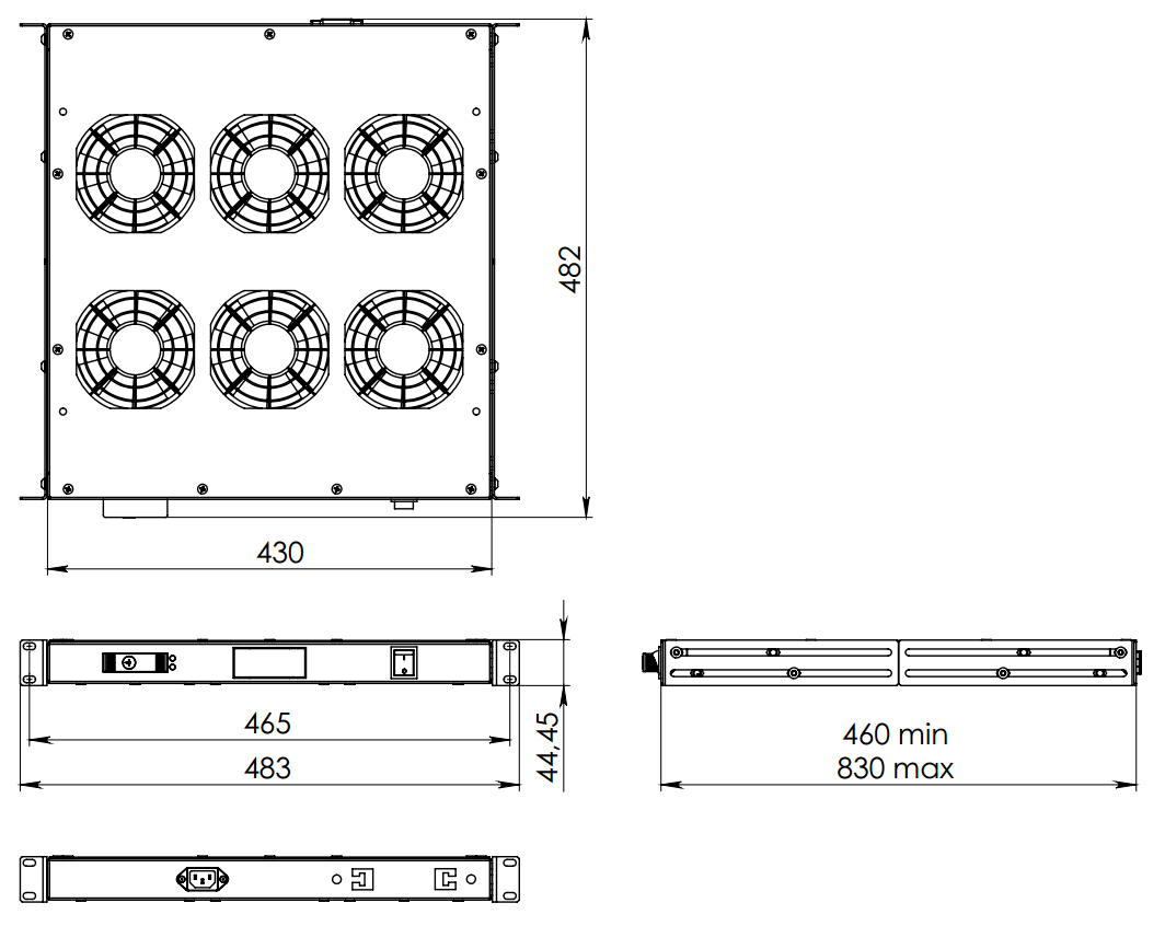 Модуль вентиляторный 19" монтируется в четырёх точках при помощи кронштейнов на монтажные направляющие шкафа в горизонтальном и вертикальном положении. Универсальные кронштейны для установки в горизонтальное положение регулируются по глубине 460-830мм.