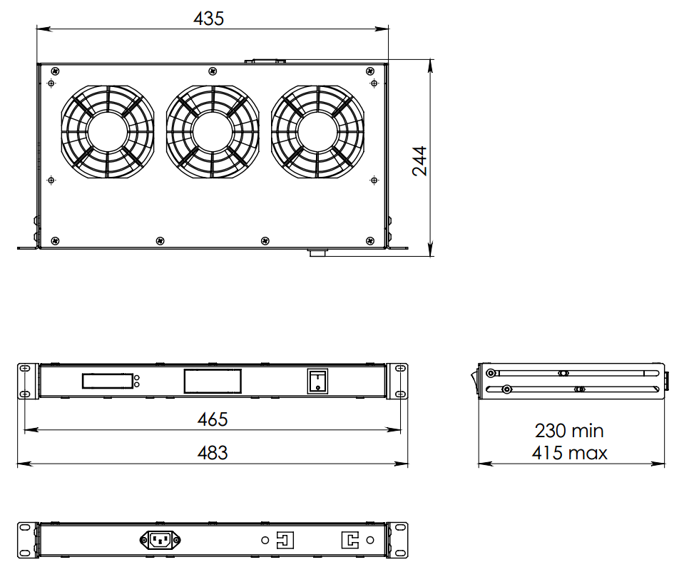 Модуль вентиляторный 19" монтируется в двух точках при помощи кронштейнов на монтажные направляющие шкафа в горизонтальном и вертикальном положении. Универсальные кронштейны для установки в горизонтальное положение регулируются по глубине 230-415мм.