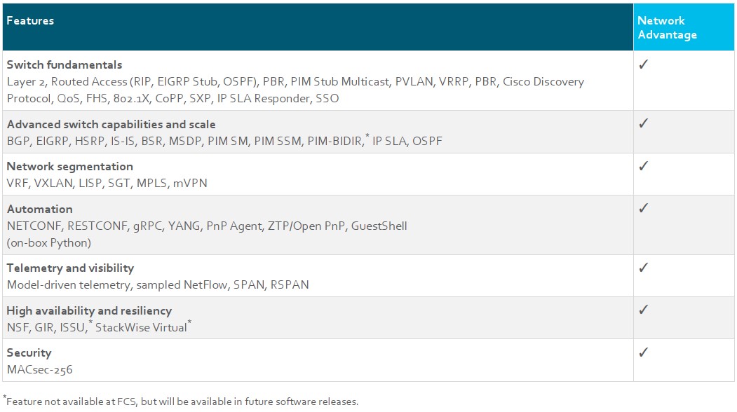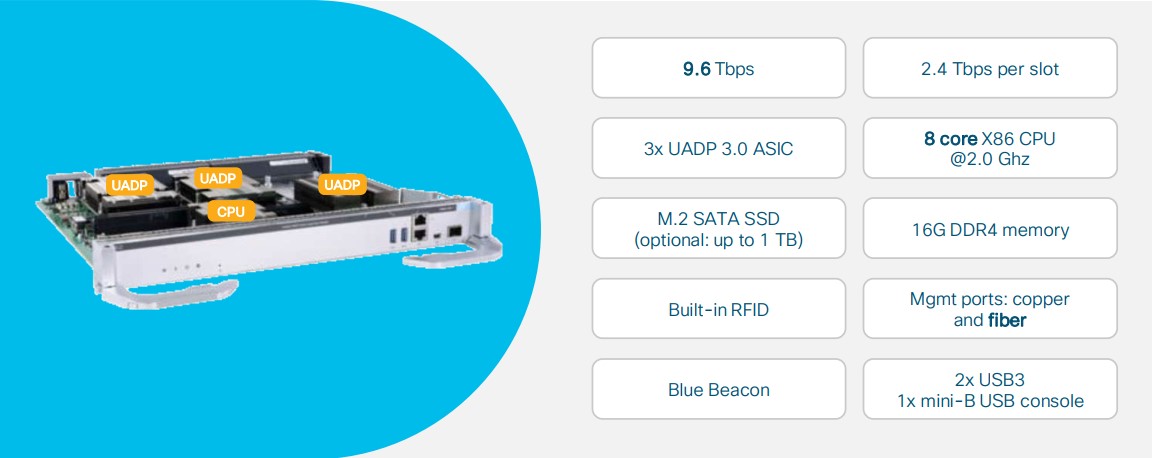 - Модуль построен на базе Cisco Unified Access Data Plane (UADP 3.0) Application-Specific Integrated Circuit (ASIC) для обеспечения максимальной производительности коммутации, маршрутизации трафика, L2 / L3 сервисов, ACL, QoS и др;