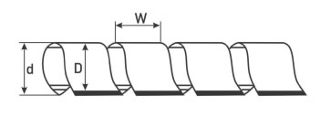 | Артикул | D, мм | d, мм | Шаг W, мм | Диаметр жгута, мм | Количество в упаковке, м | Вес упаковки, кг |