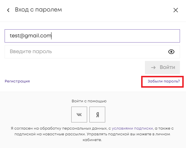 В модальном окне выбираем "Войти с паролем". Метод авторизации с помощью восстановления пароля подходит в том случае, если ранее Вы не авторизовывались с помощью логина и пароля, но знаете свой логин (которым может являться электронная почта)