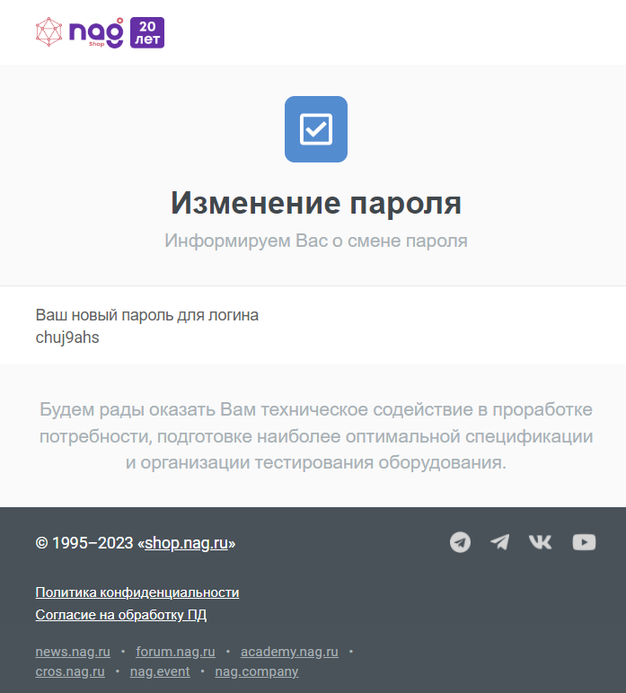 После чего на вашу почту придет письмо с новым паролем для входа.