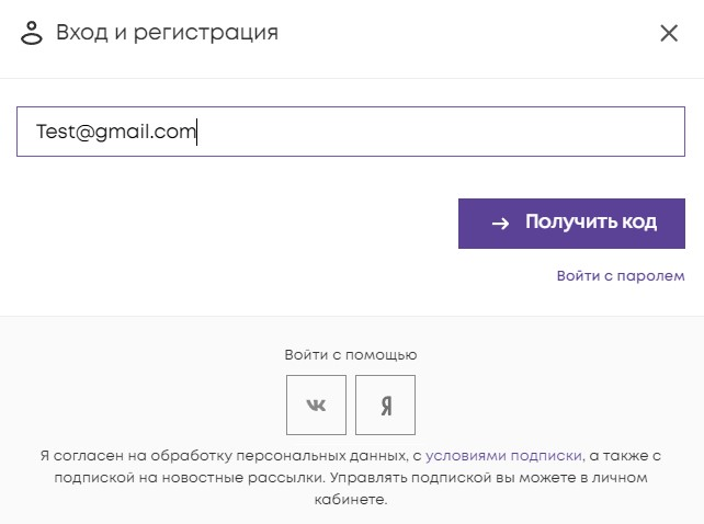 В модальном окне в поле "Телефон или E-mail" вводим адрес почты и нажимаем "Получить код".